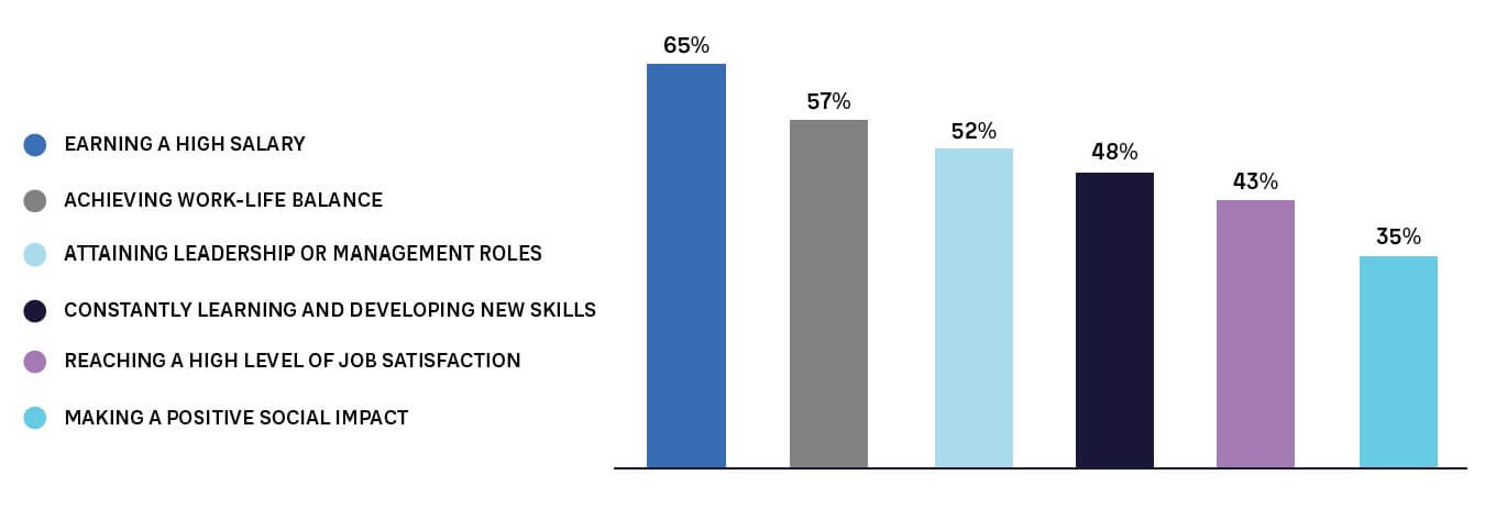 Figure 2 shows that Gen Z has strong requirements across several areas. When asked to choose the three most important aspects of a successful career, nearly two-thirds of participants listed earning a high salary as one of the factors. They also aspire to achieve work/ life balance while seeking managerial roles and constantly developing new skills.