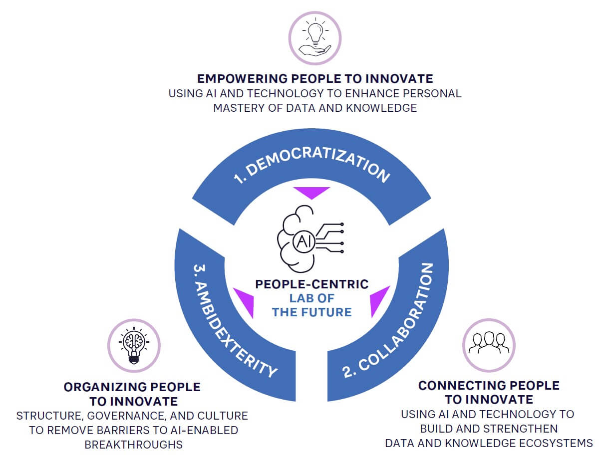 The lab of the future is the target destination for any large organization aspiring to break out of the traditional R&D mold. At its core, it aims to make people into “perfect innovators” to realize strategic objectives, akin to automatic driving aids aiming to make people into “perfect drivers.” This is about much more than offering technology and hoping for the best. Instead, it means re-engineering a fully people-centric lab approach, enabled by AI and other digital tools, based around three key components: democratization, collaboration, and ambidexterity (see Figure 1).