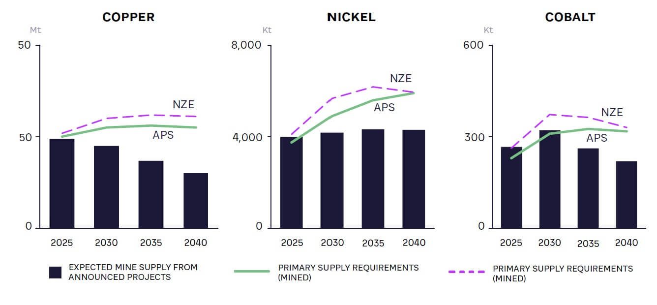 Figure 2. Projected demand for copper, nickel, and cobalt versus land mining supply