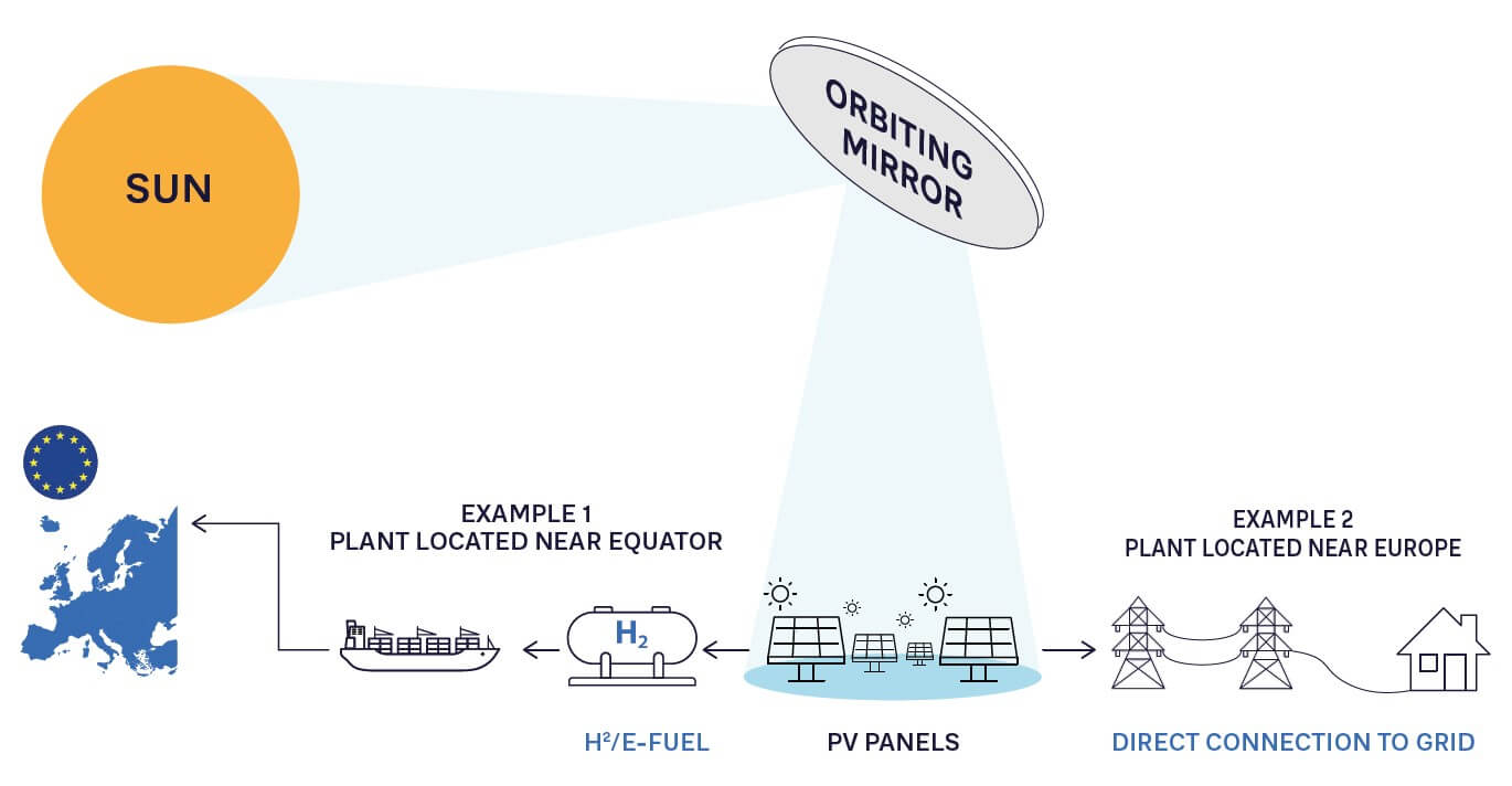 The technology concept examined to date involves deploying into space an array of 4,000 mirrors, each approximately 1 km in diameter, at an orbit altitude of 890 km. The orientation of the mirrors is automatically controlled to illuminate a spot on the Earth’s surface that is approximately 8 km in diameter. The array is given an orbital path around Earth that enables it to cover many ground-based solar farms. (The concept evaluation considered 30 such farms.) The array covers each solar farm’s dawn and dusk hours before moving on to the next one along the orbital path. To prevent the “solar spotlight” from the array from affecting any populated areas, a clear space with a diameter of 15-20 km would be needed around each solar farm. This means that many of the likely solar farm candidates for DSR would be off-grid. Indeed, many of the world’s largest solar farms located near the equator, now and in the future, are or will be off-grid. Instead of delivering electricity, they produce green hydrogen, which is shipped by pipeline or boat to commercial or industrial customers. Today, hydrogen is produced from a solar PV farm by using the power to electrolyze water — this is the typical way of transmitting the energy produced when a direct grid connection is not feasible – emerging technologies such as solar fuel cells could generate hydrogen directly from solar energy, without the use of electricity in the process, leading to triple the yield rate.