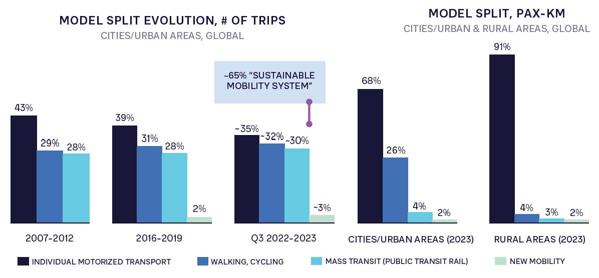However, the bigger picture is less rosy. If we consider that mass transit, walking/cycling, and shared mobility modes were collectively sustainable over the 15 years leading up to 2023, the share of these modes has only grown from some 57% to around 65% globally, while the remaining 35% of trips are still made by private car. And if we look at pax-km instead of trips, we see that private cars still represent about 70% in urban areas and 90% in rural areas (see Figure 1).
