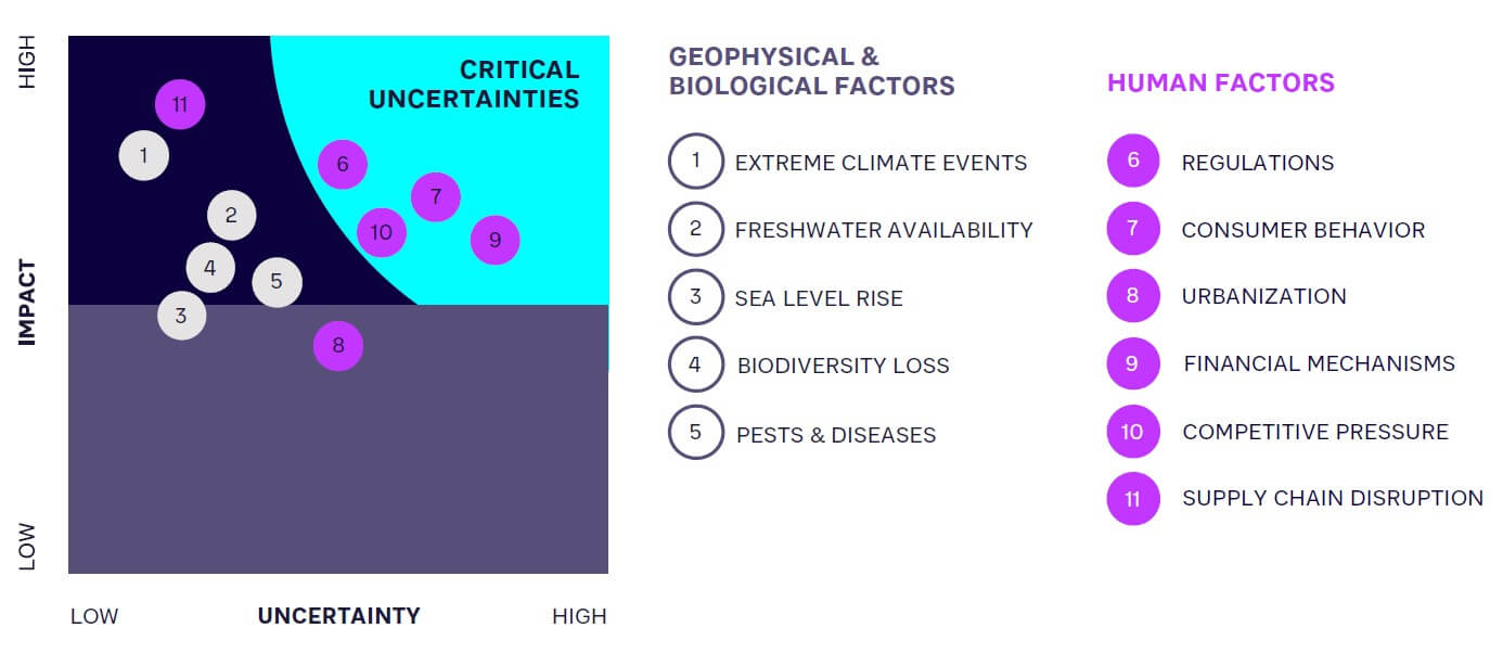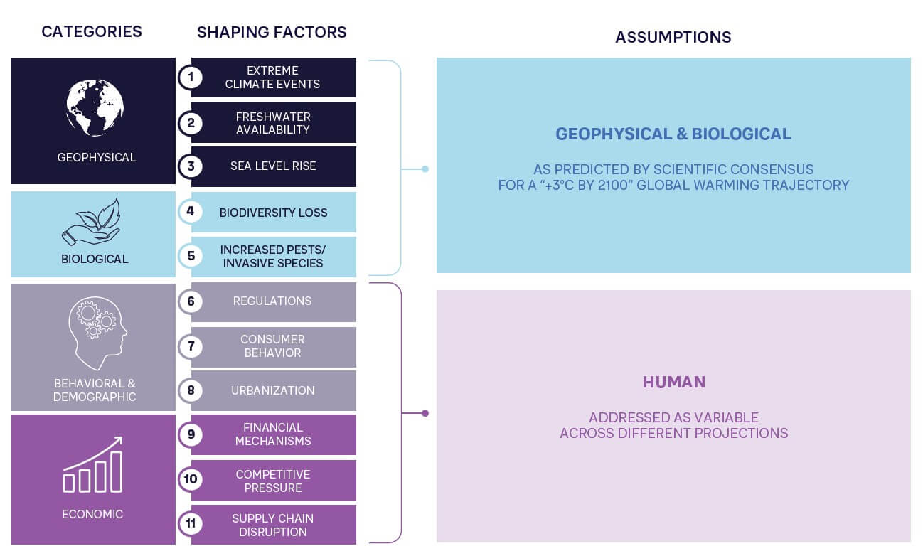For geophysical and biological factors, we adopted a “+3°C by 2100” trajectory. This falls within the confidence interval for the Intergovernmental Panel on Climate Change’s (IPCC’s) Representative Concentration Pathway (RCP) 6.0, which predicts a temperature increase of ~+2.8°C versus pre-industrial levels, with a possible range between +2.0° and +3.7°C. This trajectory considers the likely target gap in 2030 based on the current delay in policy and climate action at large. Therefore, it allows for a cautiously pessimistic but realistic outlook against which to consider adaptation challenges. To understand what this future means, it is worth considering some representative impacts across our five relevant shaping factors (see Figure 2).