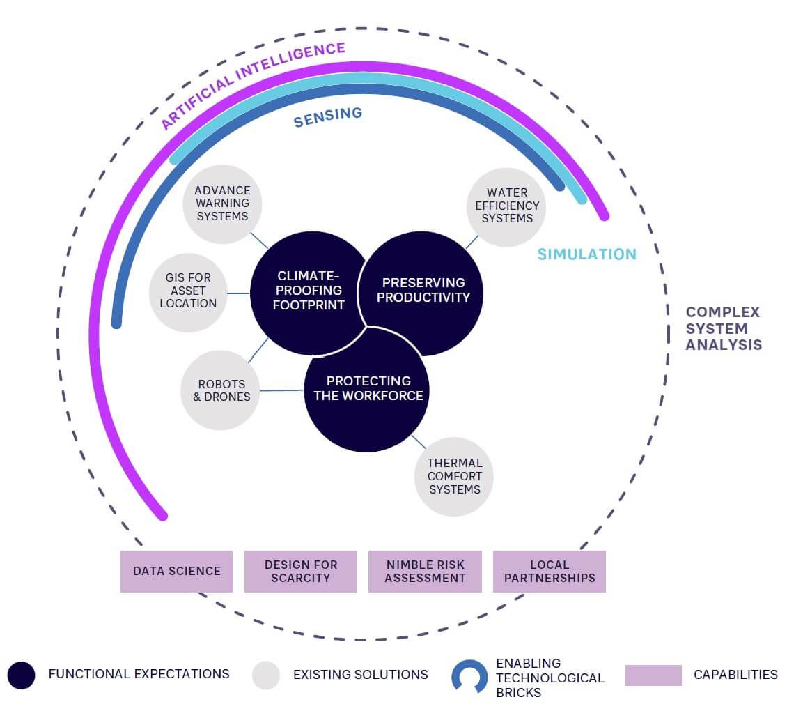 Looking across the whole adaptation technology space, some “no- regret” candidates are relevant for most industries, regardless of the projection. They address three major recurring functional expectations: risk-proofing the industrial footprint, preserving productivity, and protecting workers (see Figure 4).